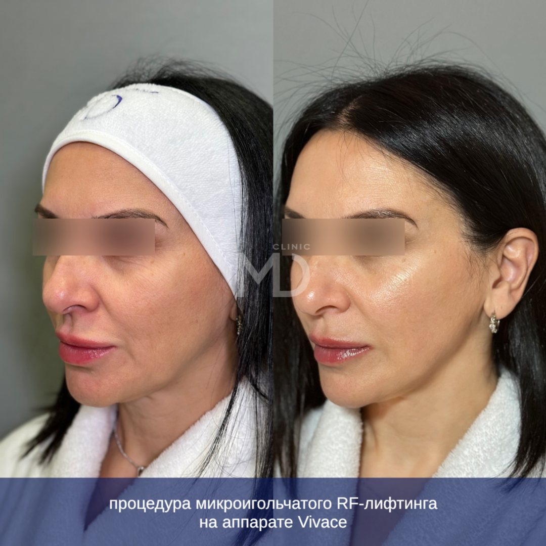 Мы в MD Clinic используем две платформы — Vivace и Ellisys Sense. Выбор аппарата и насадки зависит от зоны, толщины кожи и цели: подтяжка контуров, работа по порам и постакне, уплотнение тканей.
