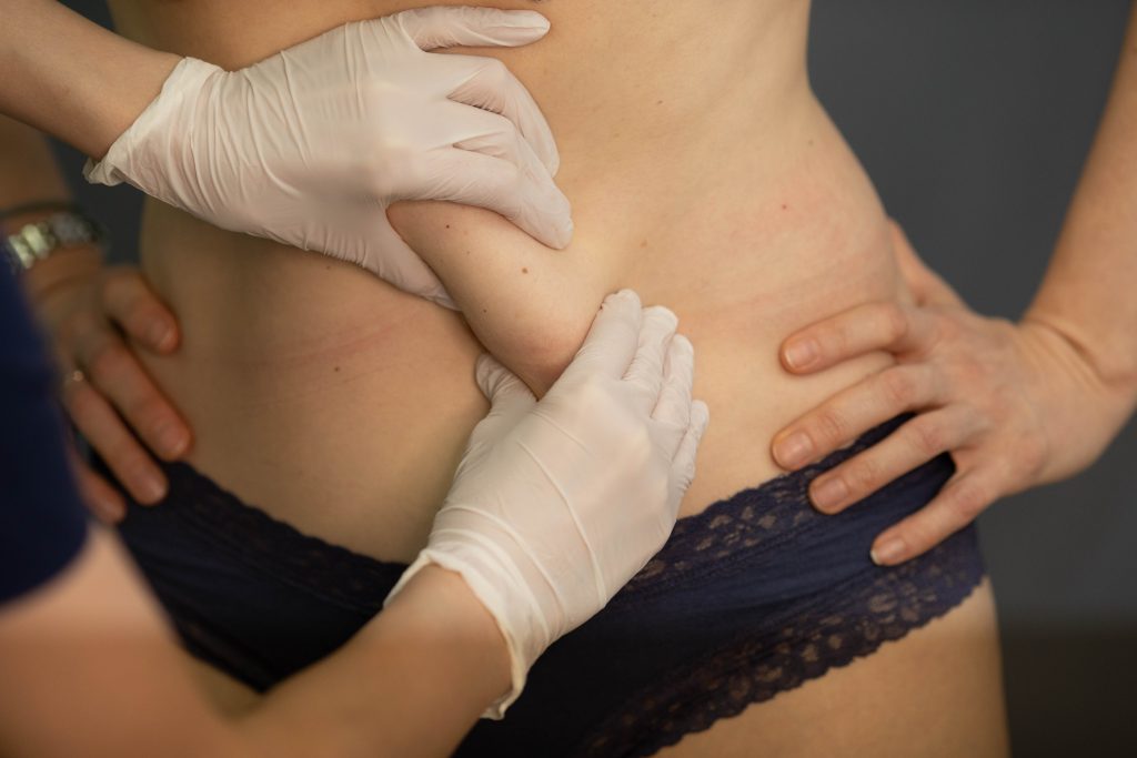 - Специалист оценивает толщину жирового слоя и распределение жировой клетчатки.
